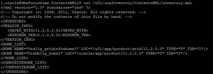 <HOME NAME="Ora11g_gridinfrahome1" LOC="/u01/app/product/grid/11.2.0.3" TYPE="O" IDX="1" CRS="true"/>