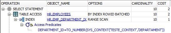 Na Listagem 10 foi executado um simples SELECT * FROM hr.employees mas que retornou apenas uma linha como resultado e podemos perceber o que aconteceu com um print do explain plan. Podem ver que foi colocado um predicado, que foi retorna da função criada anteriormente. E assim ele utilizou um índice com base nisto.