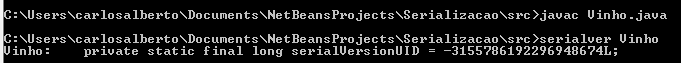 Oprimeiro passo é compilar a classe e gerar um arquivo .class. Em seguida, no terminal do sistema operacional, é invocadoo comando serialver [classname] que mostra o valor gerado conforme Figura 1.