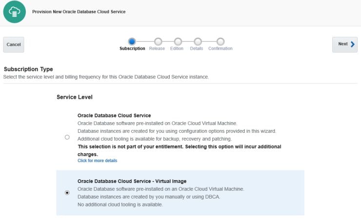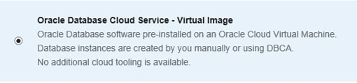 Também já é marcado como default o serviço que foi contratado. Neste artigo, por exemplo, a opção “Oracle Database Cloud Service – Virtual Image” já está marcada.