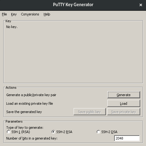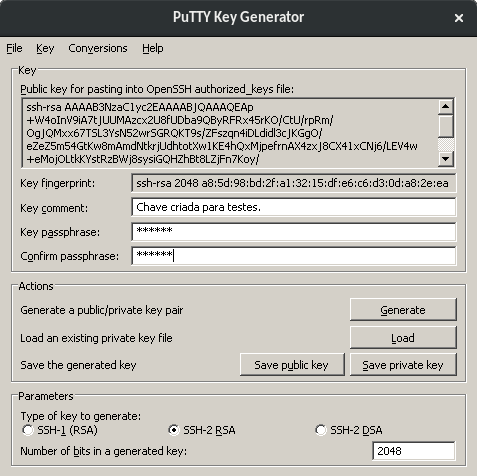 No parte inferior, em “Parameters”, são definidos o tipo de chave que será utilizado e o seu tamanho em bits. Neste artigo, será usada a chave SSH-2 RSA de 2048 bits.