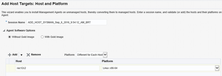Vamos preencher as informações dos campos “Host” e “Platform” para o nosso exemplo: Host = rac12c2 Platform = Linux X86-64
