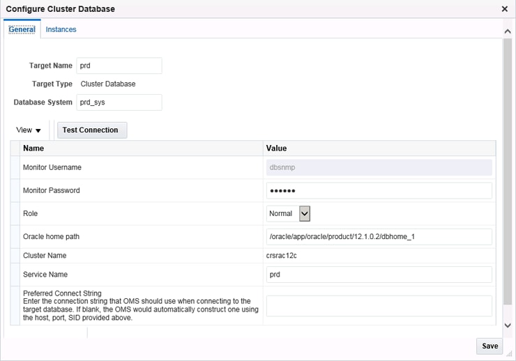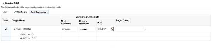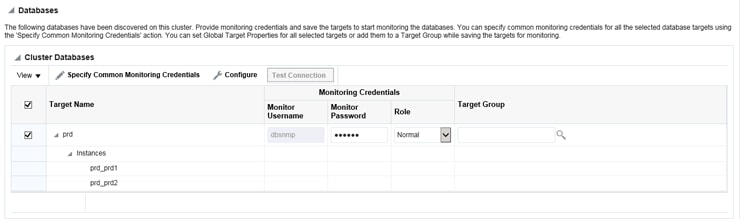 Primeiro serão apresentadas as instances do nosso cluster. Basta inserir as credenciais do usuário DBSNMP e verificar se as informações dos nós estão corretas. Para isso clique em “Configure” e depois em “Test Connection”.