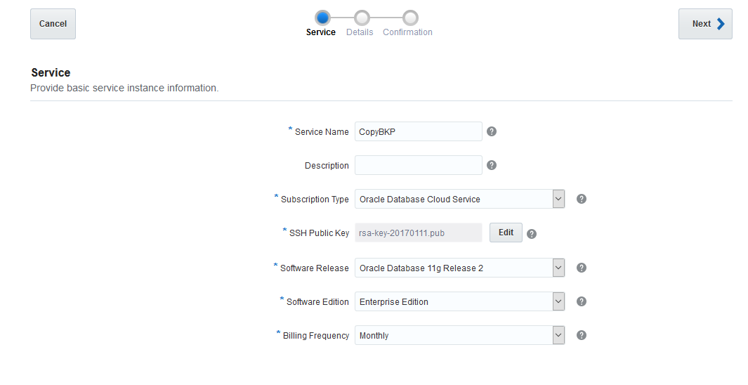 Faça login na página "Oracle Database Cloud Service" para criar um novo serviço seguindo os passos abaixo: