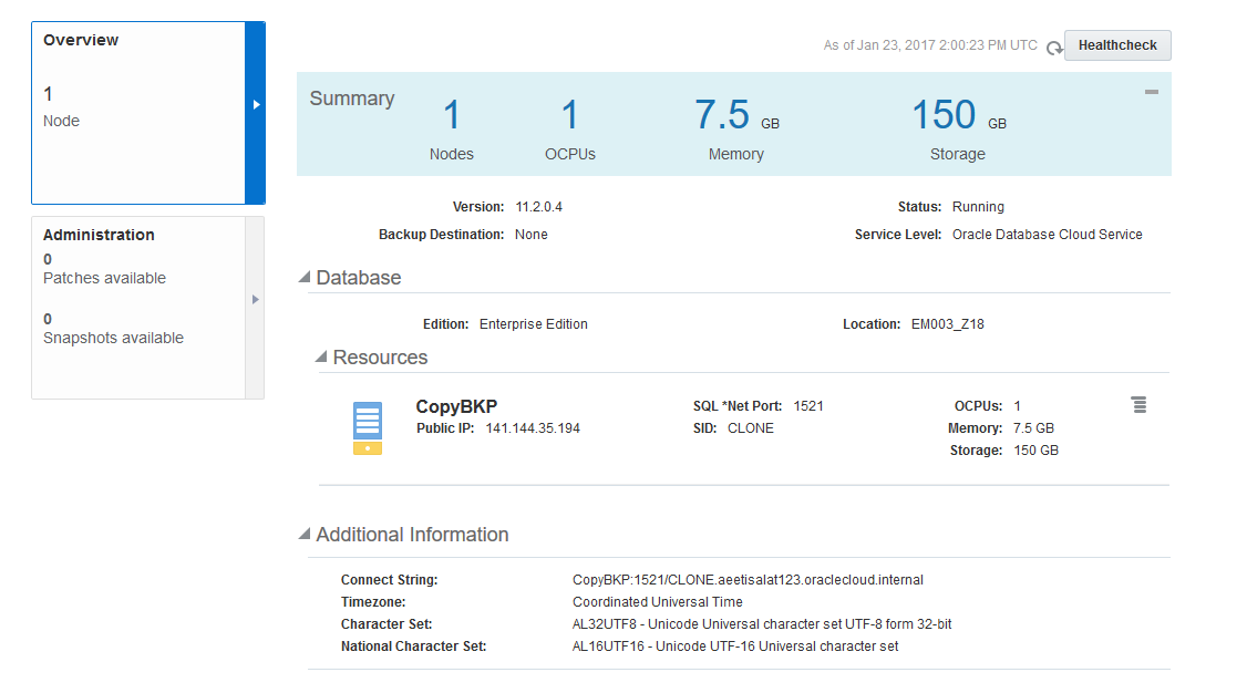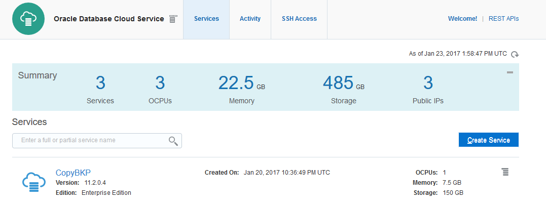 Clique então no nome do serviço (CopyBKP) para abrir a página principal do banco de dados e ver um resumo das suas características.