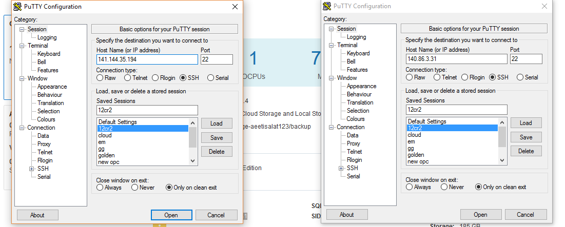 Agora abra 2 diferentes instâncias do Putty e conecte-se via SSH em ambas as máquinas mostradas abaixo: