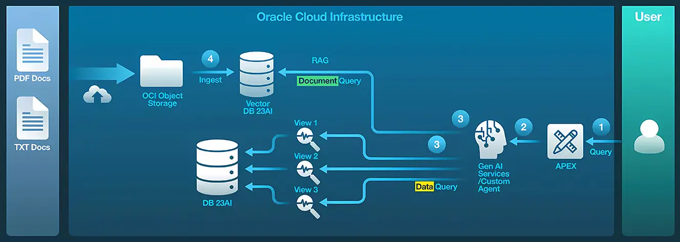 - Natural language data queries: Select AI translated free-text queries into context-aware, metadata-enriched SQL executed on Autonomous Database 23ai with results displayed in APEX.