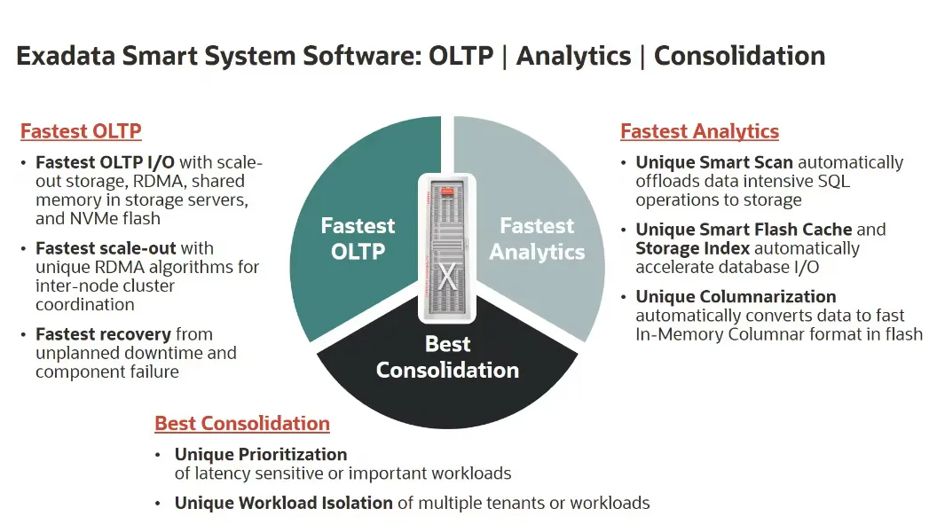 Exadata is a combined hardware and software platform that includes scale-out database servers, scale-out intelligent storage servers, ultra-fast networking, memory acceleration, NVMe flash, and specialized Exadata Software. Exadata is designed to optimally run any Oracle Database workload or combination of workloads. The platform is also frequently used to consolidate many databases that previously ran on dedicated database servers. Exadata's scale-out architecture is naturally suited to running in OCI, where computing requirements can dynamically grow and shrink.