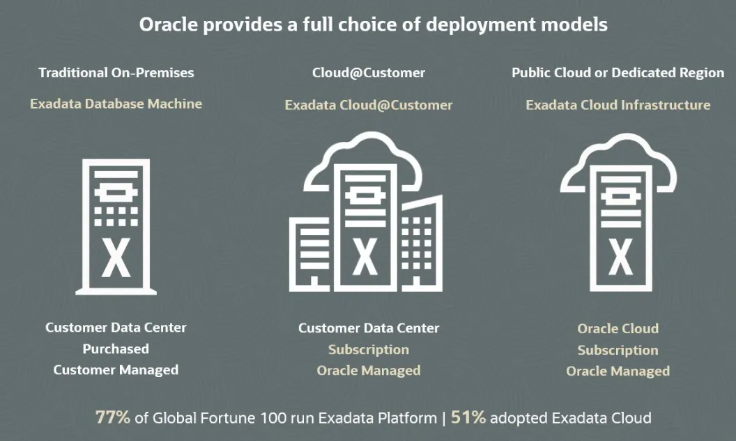 Best of all, Exadata runs where you need it, on-premises, as a hybrid cloud, or in the public cloud.