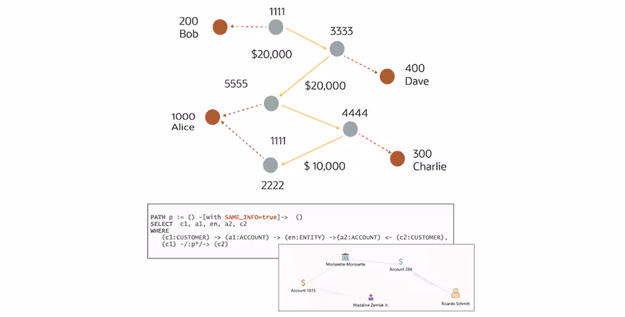 图形数据库将信息存储为节点网络,节点代表实体(如账户或交易),边则表示连接节点的关系。查询数据库时,它通过查询这些预定义的边从一个节点跳转到另一个节点,从而在数据中发现模式和路径。