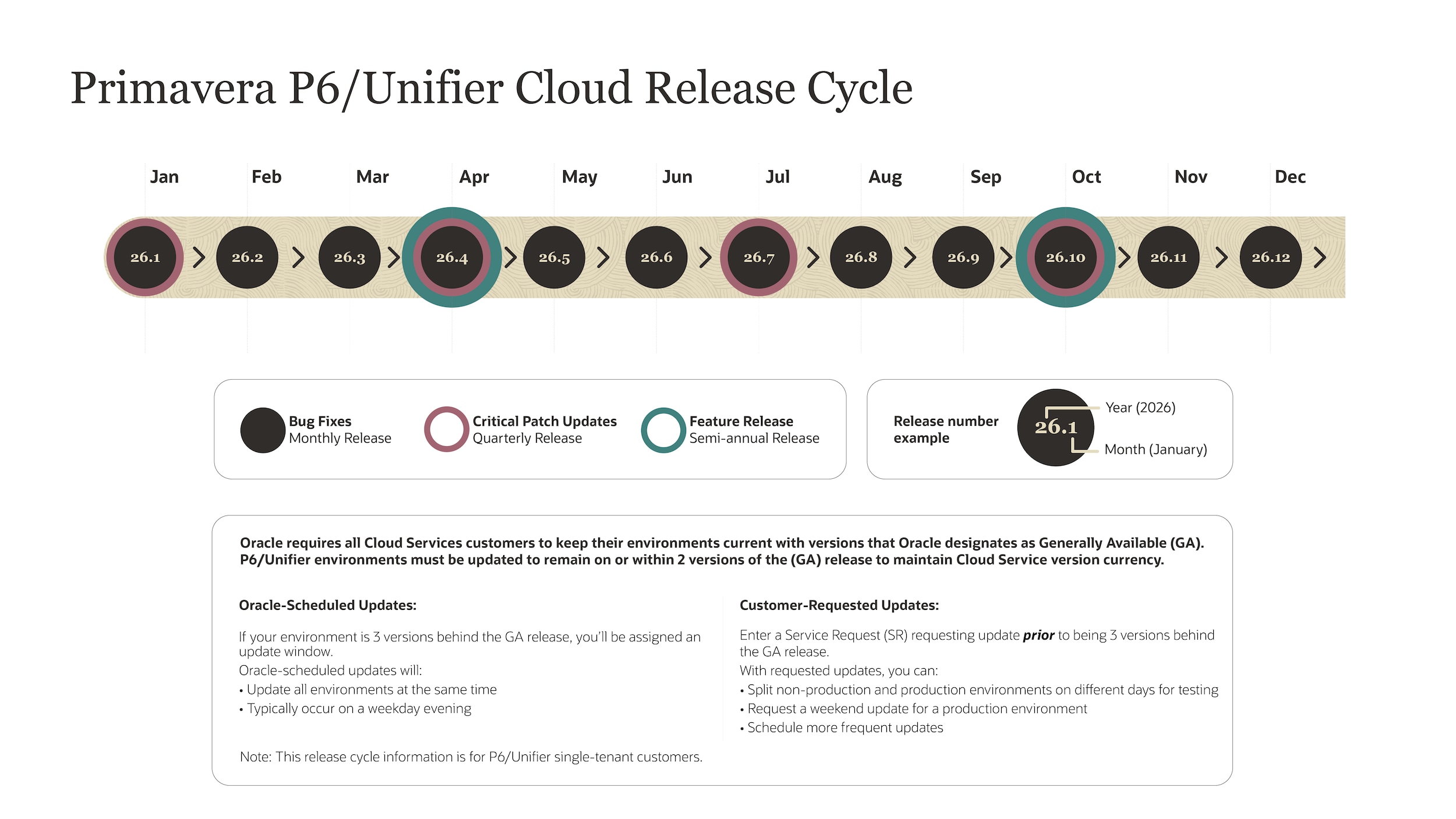 Oracle requires all Cloud Services customers to keep their environments current with versions that Oracle designates as Generally Available (GA). P6/Unifier environments must be updated to remain on or within 2 versions of the GA release to maintain Cloud Service version currency.