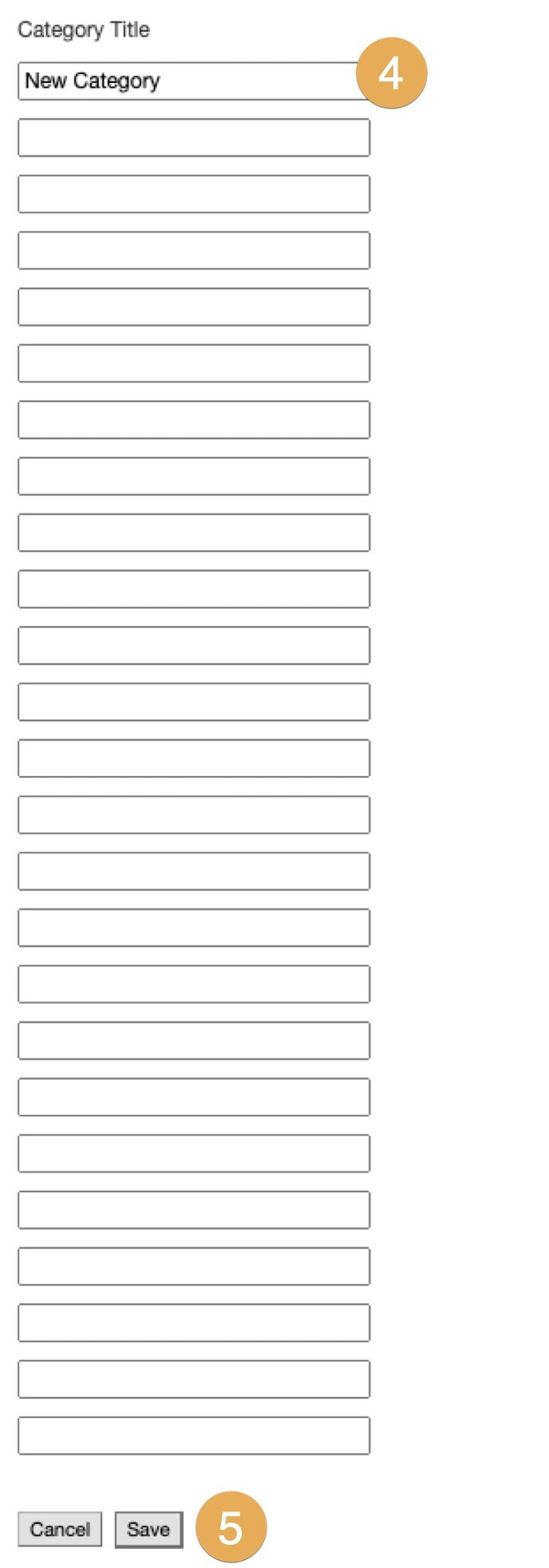 4. Type categories names, as needed. 5. Select Save at the bottom of the dialog box. The system adds the new categories.