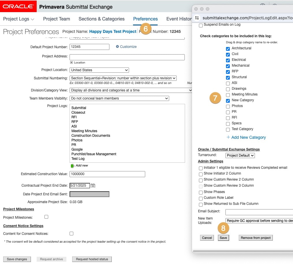 6. Click Preferences to add new categories to the applicable log. 7. When the box opens, scroll down and check the box of the new categories. 8. Click Save at the bottom of the dialog box.
