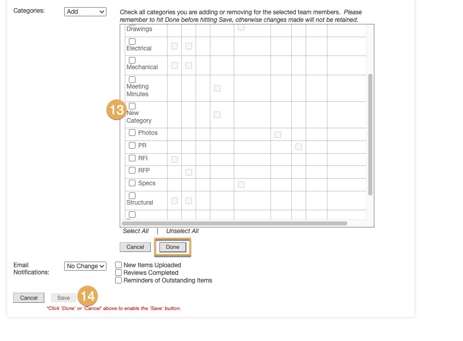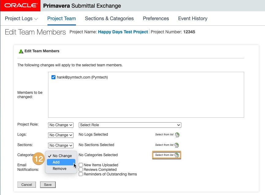 12. The Edit Team Members dialog box will open. Select the Categories drop-down and choose Add.