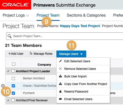 9. Click Project Team to add new categories to all project team members profiles. 10. Place checkmarks in boxes next to all project team members to edit. 11. Click Manage Users then Edit Selected Users.