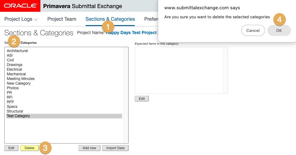 Click Delete below the left table. ClickOK in pop up window. Note: the system will not allow you to delete a category if there are documents uploaded to that category.
