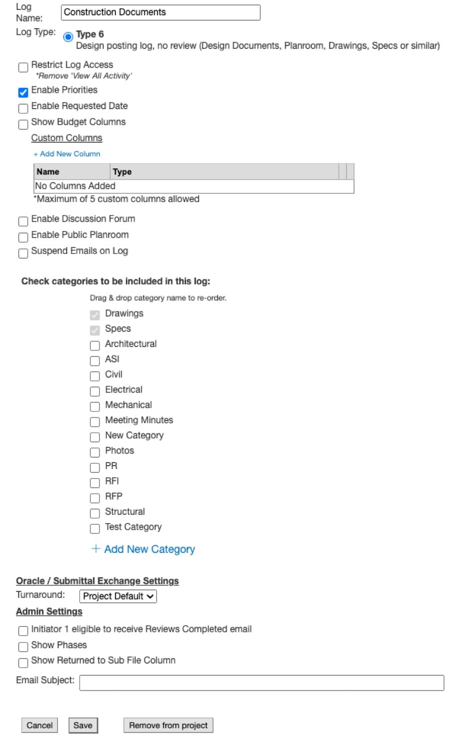 Log Type 6 is a Design posting log and is typically used for larger files. Does not include a review process. It is organized by categories such as Design Documents, Planroom, Drawings, and Specifications.