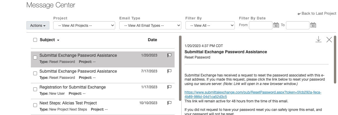 You can view all automated emails from Submittal Exchange. These are emails you receive from notifications@submittalexchange.com.