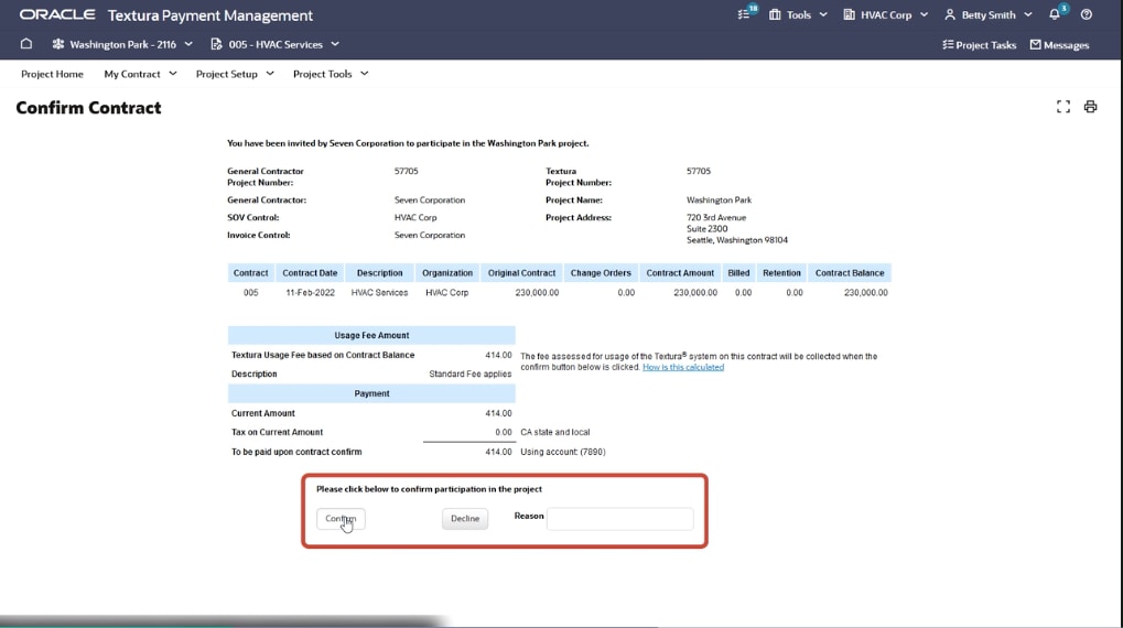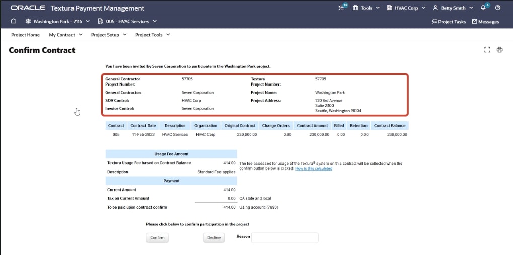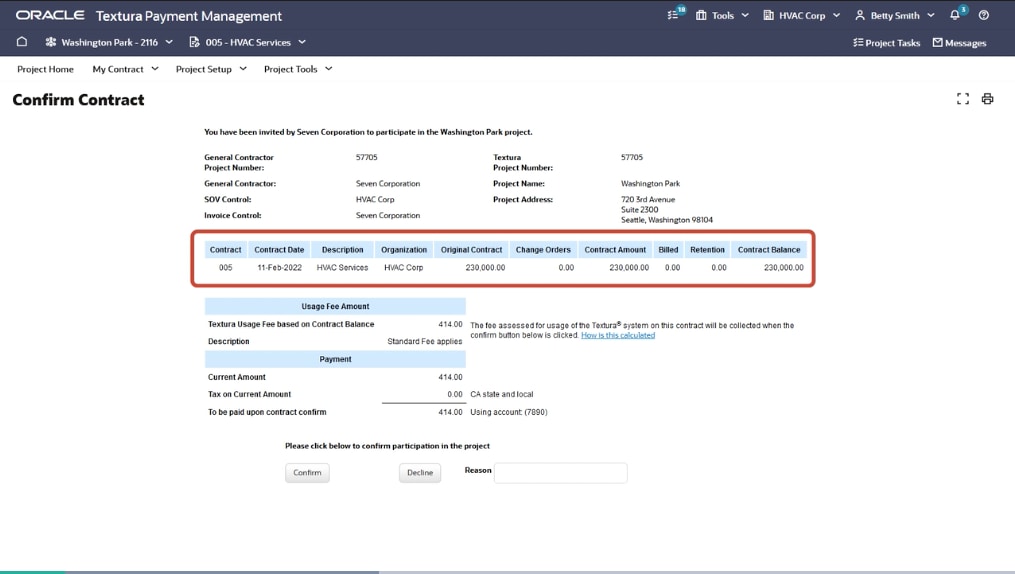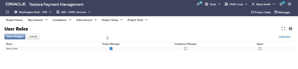 After confirming the contract, you may need to assign Textura users to the project if there are other members in your organization. The User Roles page displays the individuals in your company who are registered to use the Textura system and the roles for which they are qualified, such as Project Manager, Compliance Manager, or Signer. (To add a new user, see the next section.)