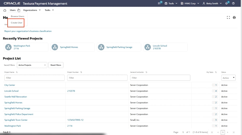 To add new users in Textura, go to the Home page. On the Users menu, click Create User. Fill in the user and contact information sections. Required fields are marked with a red asterisk.