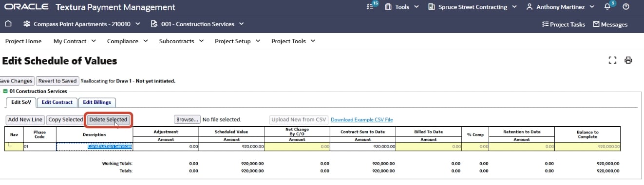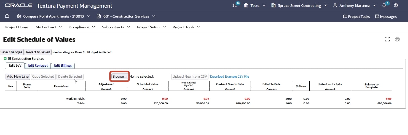 Cut and paste your Schedule of Values into the example spreadsheet and save the file. In Textura, delete the single-line entry. Browse to select your saved Excel file and click Upload.