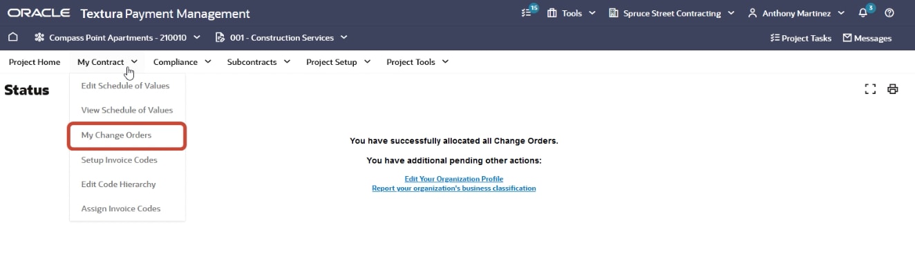 The page displays the number of Change Orders you have to allocate and the Change Order you are currently allocating with dollar amounts.