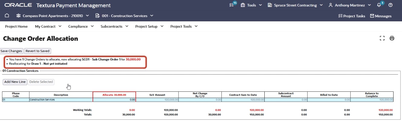 However, the Change Order is reflected in the Allocate, Net Change By Change Order, Contract Sum to Date, and Balance to Complete columns.