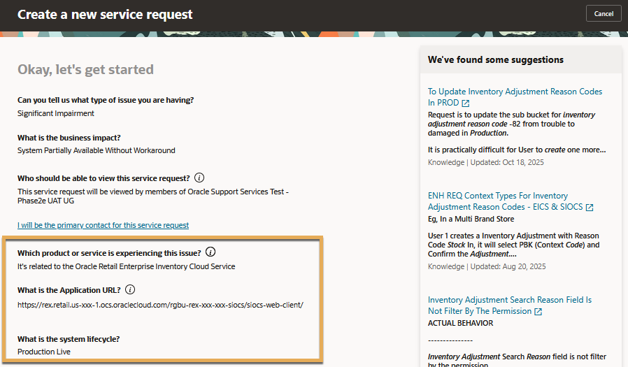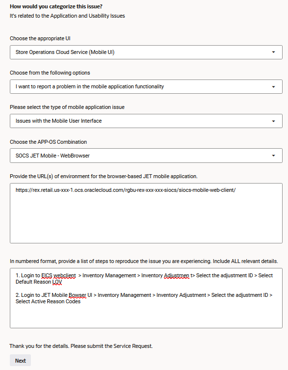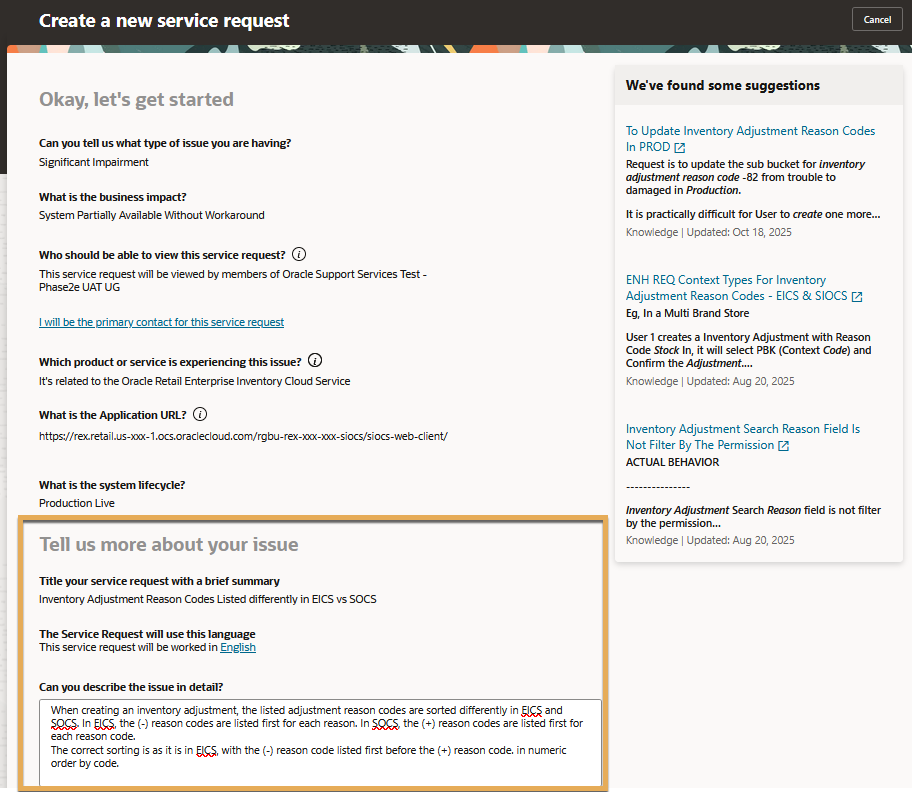 1. You'll begin with the issue type, which can range from general guidance to a critical outage. The issue type you select will determine the severity level of the SR. It's crucial to select the correct type so Support can accurately prioritize the issue. See the Severity Definitions section in the Oracle Cloud Hosting and Delivery Policies or the Technical Support Policies.