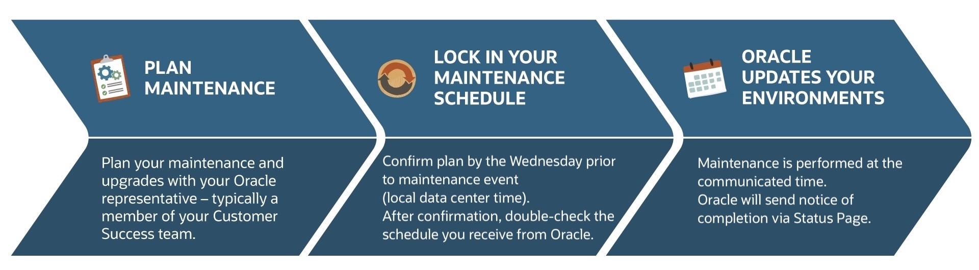 Prior to maintenance, your Oracle representative, typically a member of your Customer Success team, is available to review your maintenance plan with you. You’ll need to actively participate in the scheduling process by completing the following steps before each maintenance event: