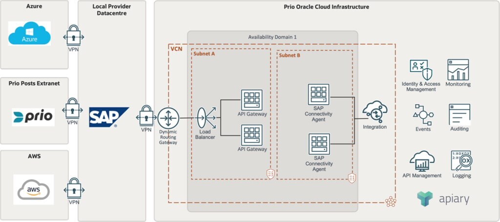 - OCI Application Integration: A visual automation platform for simply connecting applications, APIs, and data using prebuilt adapters such as SAP and sFTP. PRIO's application ecosystem spanned cloud providers and included on-premises systems.