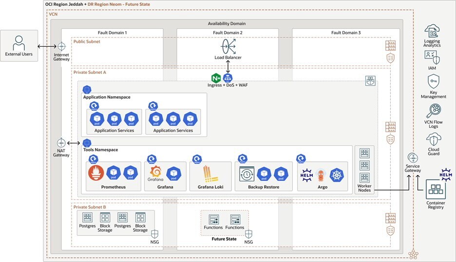 OCI provided numerous managed services and features, such as OKE, managed backup, three fault domains in every availability domain, shared volumes, File Storage service, and S3-compatible storage. These features combined have helped reduced Takamol's operational overhead dramatically.
