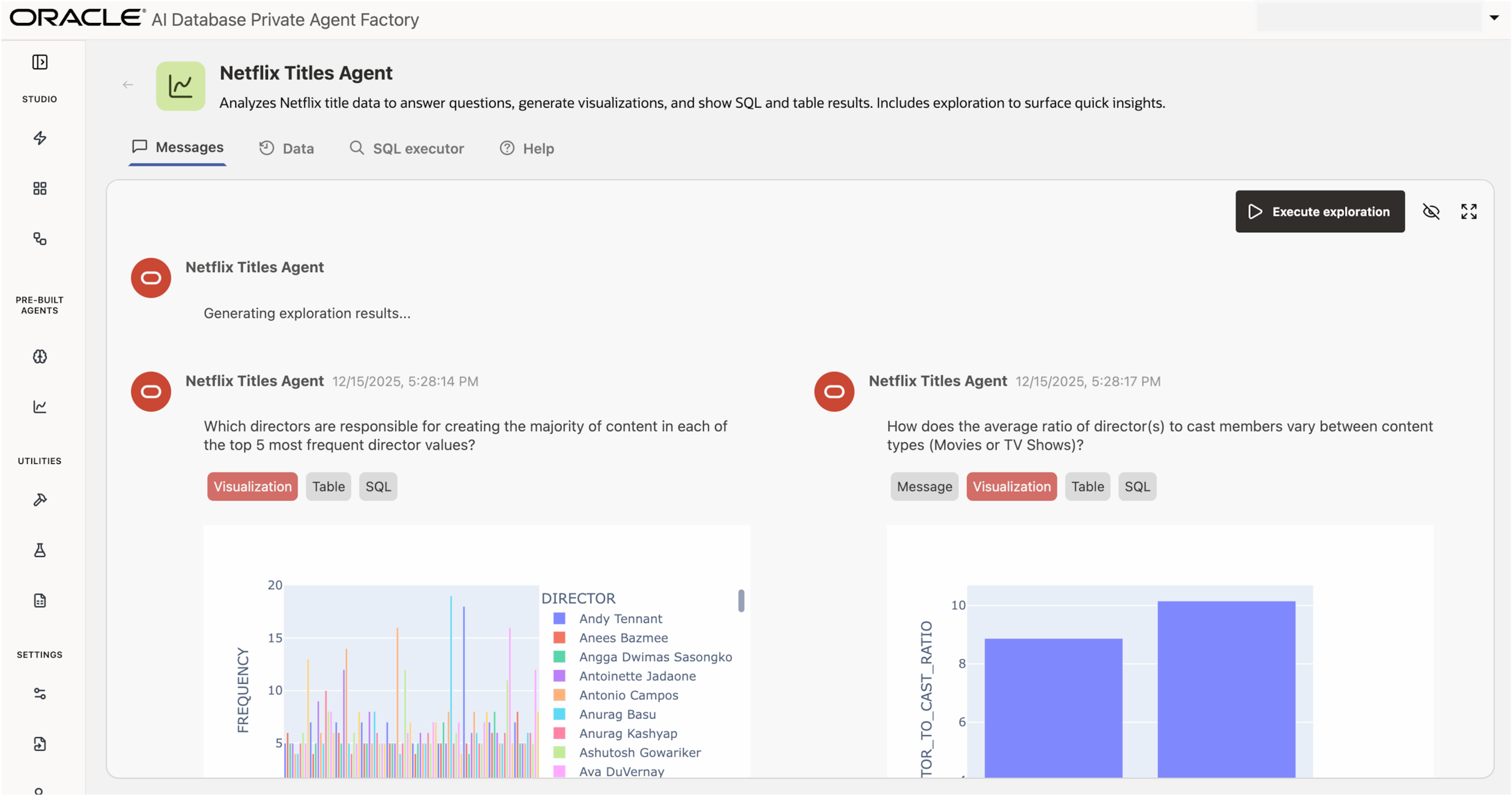 Analyze schemas, generate questions and explanations, and auto‑build visualizations on Oracle AI Database 19c+ while the LLM reasons over metadata.