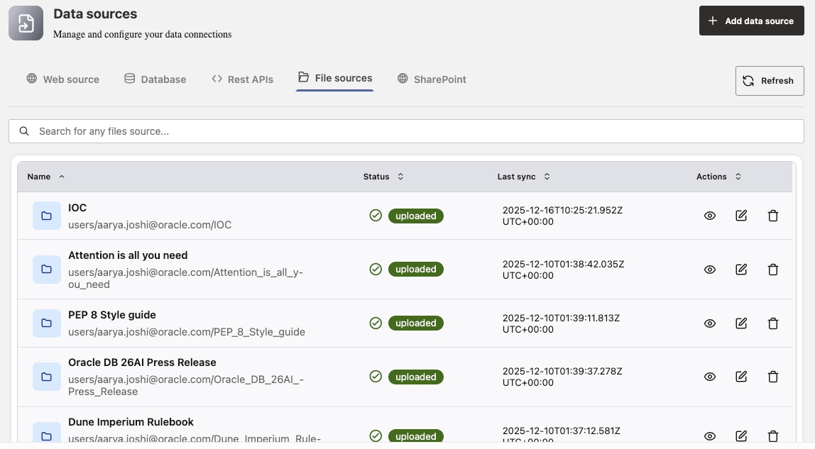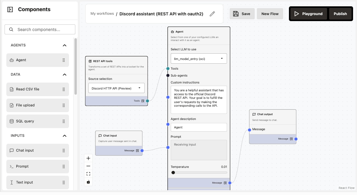 Connect Oracle AI Database, SharePoint, websites, file systems, and OCI Object Storage; upload OpenAPI 2.0/3.0 JSON or integrate MCP servers to auto‑create tools and orchestrate SQL and REST in one flow.