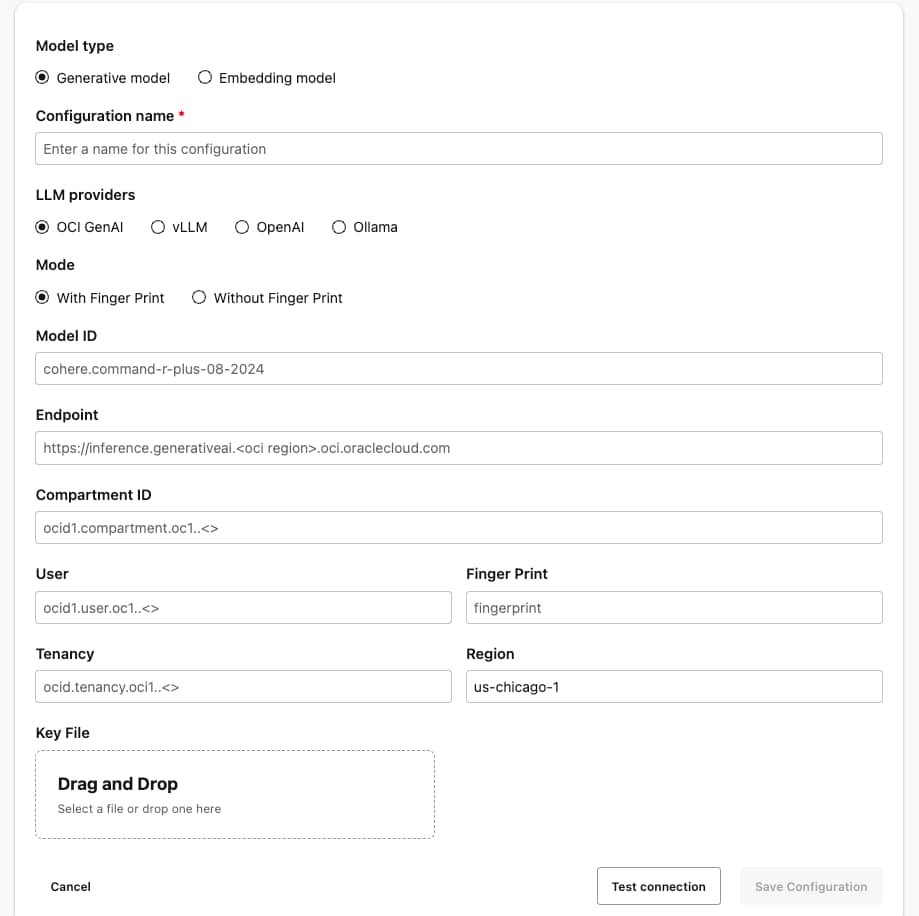 Select the best model per task or cost profile—OCI Generative AI, Meta Llama, Cohere Command, OpenAI gpt‑4o family, Grok, Ollama, or vLLM and compare outputs in Prompt Lab.