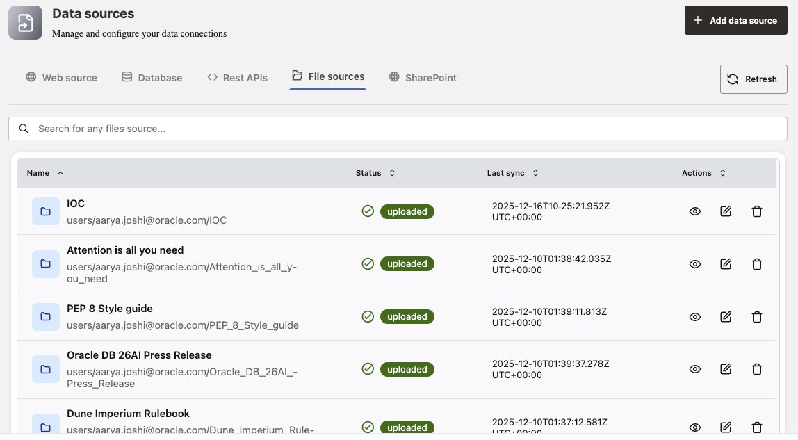 Leverage the full power of Oracle AI Database and bring AI to your data with AI Vector Search and built-in RAG pipelines, rich analytic SQL, Documents, Spatial, Graph, etc. This works with Oracle Database 19c data, and you can access data in repositories like Sharepoint, Google Drive, and others