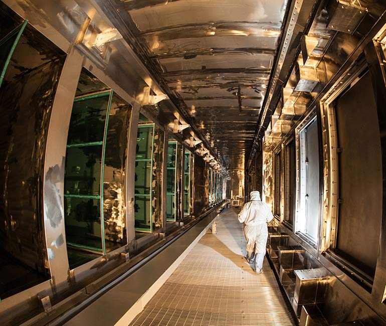 An NIF operator walks along the lasers’ long path, which the beams traverse while gaining speed and focus.