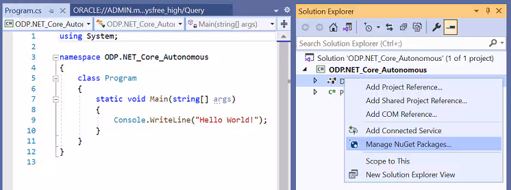 This tutorial shows you how to connect .NET applications to Oracle Autonomous Database (ADB) using Oracle Data Provider for .NET (ODP.NET) Core, Visual Studio 2019, and the Oracle Developer Tools for Visual Studio extension. Follow the steps below.