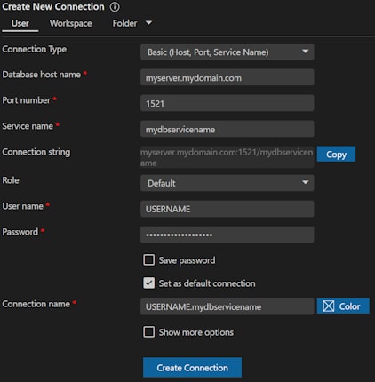 If you wish to connect to an Oracle Database using a host name/IP address, port number, and service name, fill in the connection dialog like so: