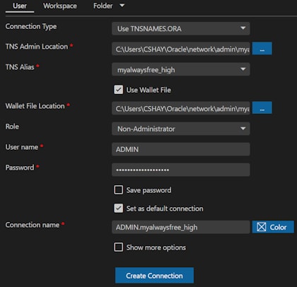 This section shows how to connect to Oracle Autonomous Database using Credentials Files. Note that it may be easier to establish this connection via the Oracle Cloud Explorer Create Connection in Database Explorer menu item. For more information on how to do that, see the Oracle Developer Tools for VS Code Quickstart.