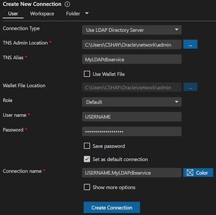 If you wish to connect to an Oracle Database using a Directory Server (LDAP), fill in the connection dialog like so: