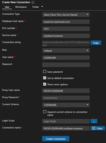 To connect using a proxy user, use any of the connection methods provided elsewhere on this web page. In addition, change the following fields in the dialog: