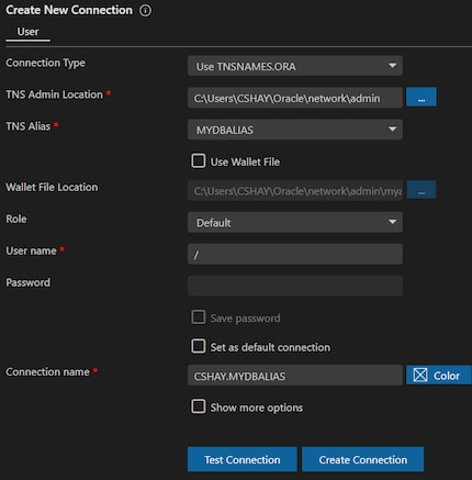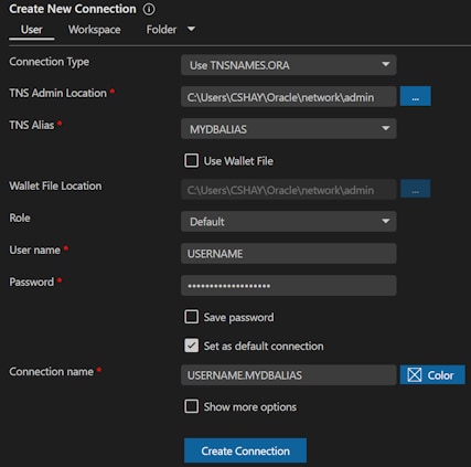 TNS Admin Location: Select the path to the directory containing your credentials files (Visit the extension settings to set a default location)