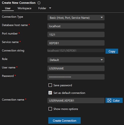Username: Username (or SYS if you need to do DBA tasks like creating a user)