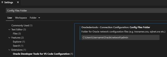 If that parameter is not set, or the SQLNET.ORA file is not found in that location, the directory set in the Oracle Developer Tools for VS Code extension setting Connection Configuration: Config Files Folder is used. If a networking config file is not found in either location, other default locations will be searched.