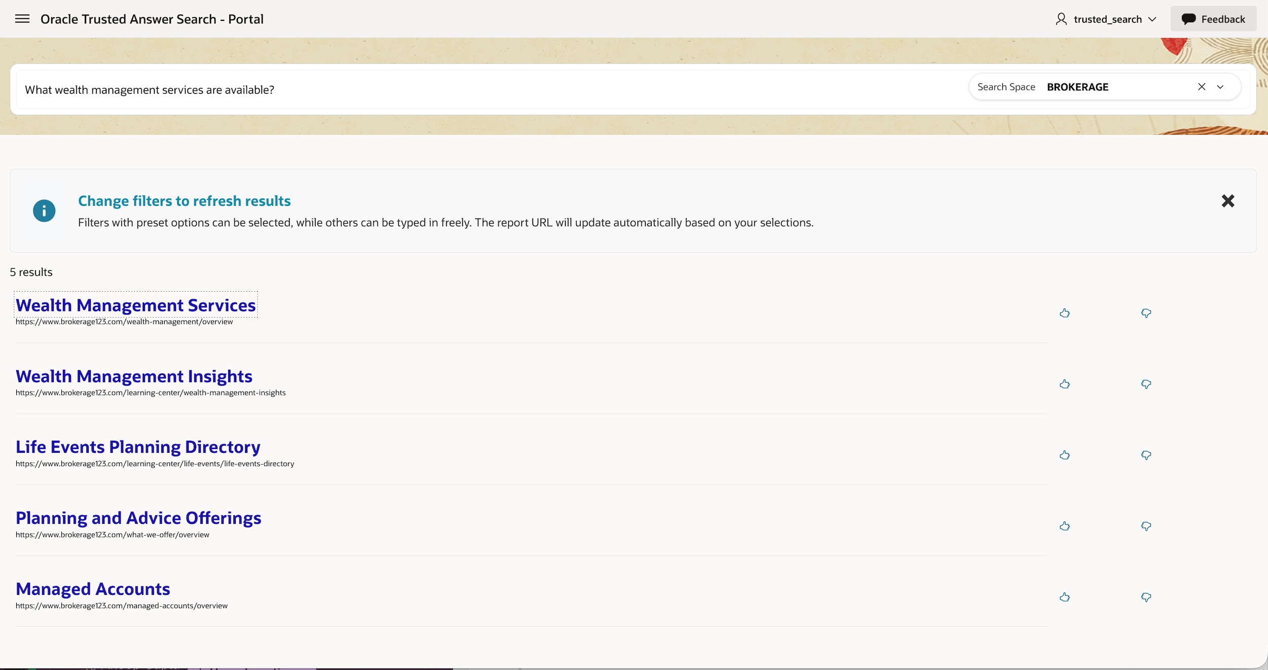 Oracle Trusted Answer Search is a semantic-search platform that helps teams build natural-language interfaces for applications where answers are accurate, secure and fast. Simple domain-specific questions like “Is the cash I added on Monday available now?” are matched to application-specific best matched documents, without resorting to using LLMs. This enables end users to get fast outcomes via natural language semantic search— without risking confidential data exposure or dealing with unpredictable responses.