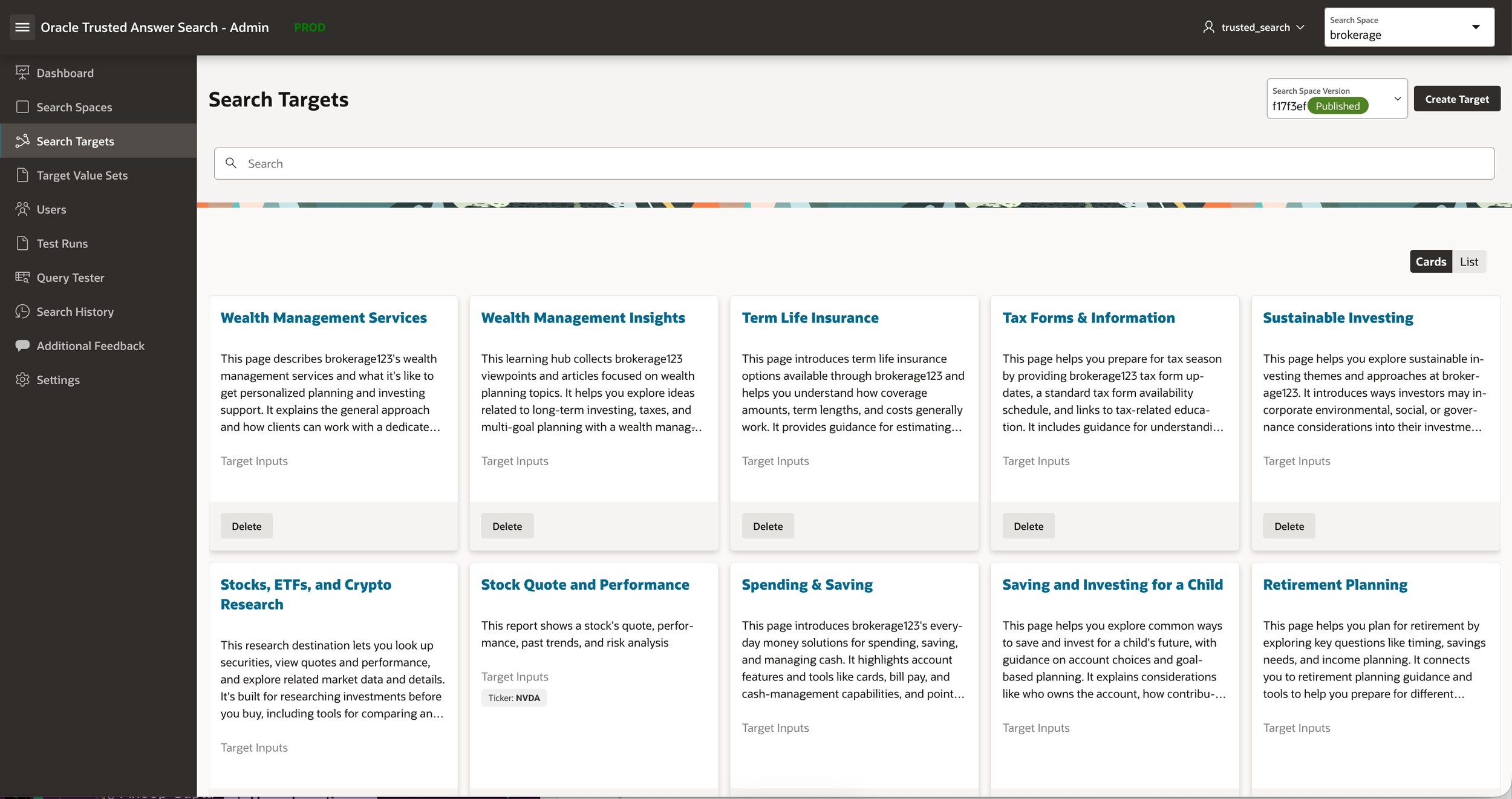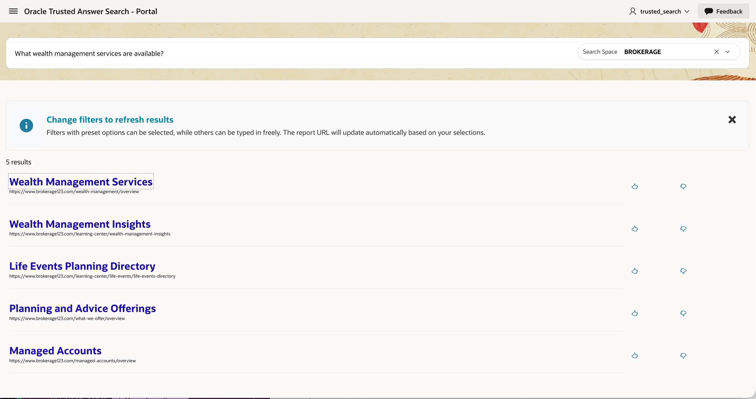 Oracle Trusted Answer Search is a semantic-search platform that helps teams build natural-language interfaces for applications where answers are accurate, secure and fast. Simple domain-specific questions like “Is the cash I added on Monday available now?” are matched to application-specific best matched documents, without resorting to using LLMs. This enables end users to get fast outcomes via natural language semantic search— without risking confidential data exposure or dealing with unpredictable responses.