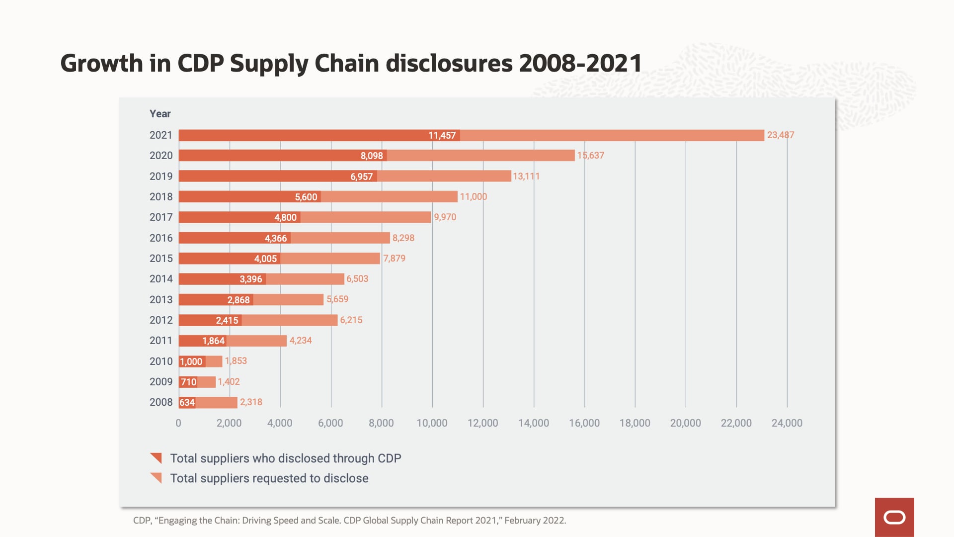Insgesamt meldete das CDP einen Zuwachs von 41 % bei den Angaben zur Lieferkette im Vergleich zum Vorjahr.