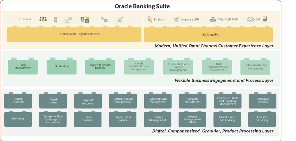 The Oracle Banking suite does not force-fit transformation to specific paths, such as an ecosystem approach or an end-to-end pre-integrated suite. Its leading-edge composability enables a bank to pick and choose any or a blend of approaches and even tailor them to the requirements of different lines of business.