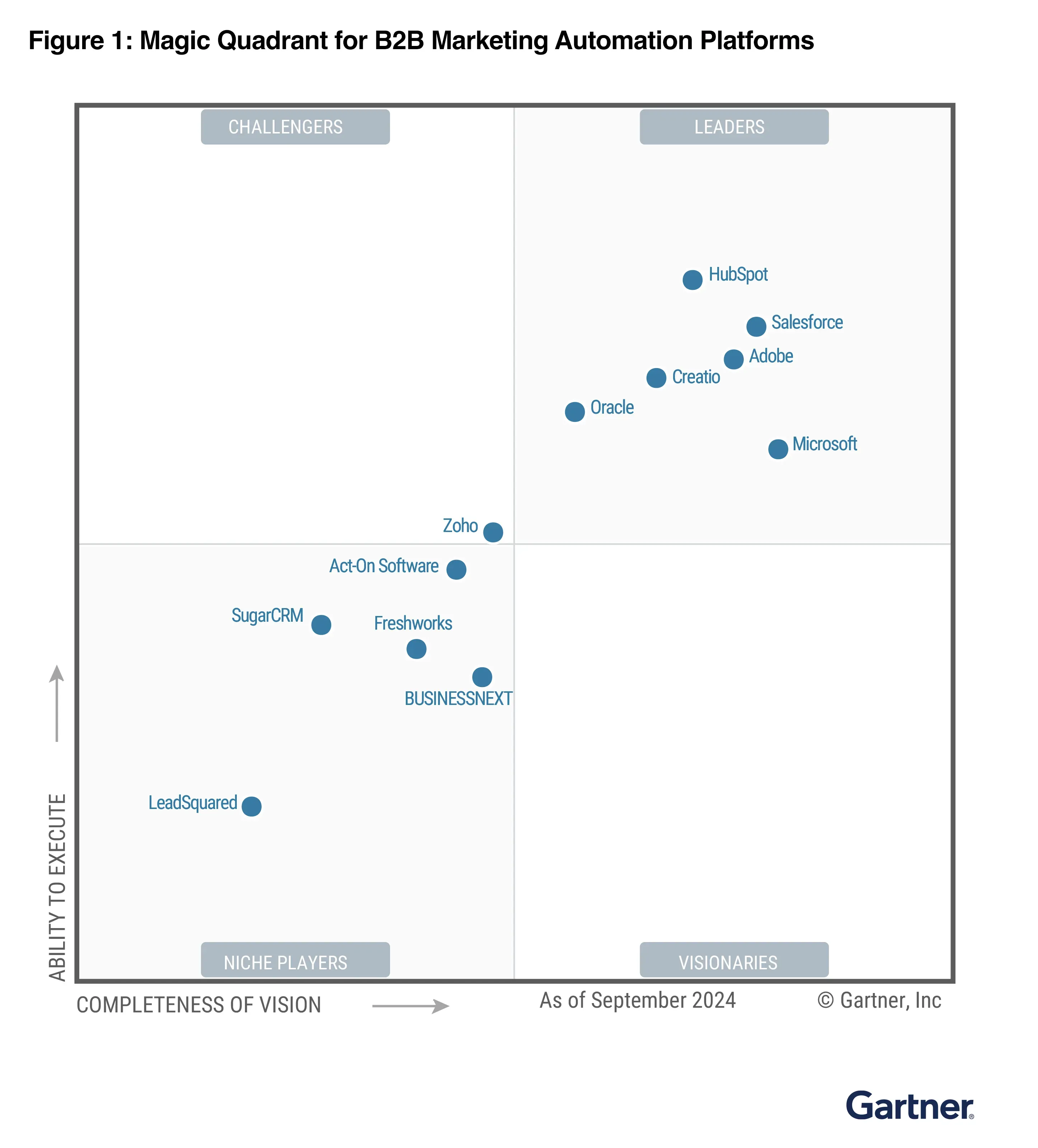 Gartner, Magic Quadrant pour les plateformes d'automatisation du marketing B2B, 23 septembre 2024, Rick LaFond, Jeff Cohen, Alan Antin, Upasna Chandna, Nicholas Mortensen.