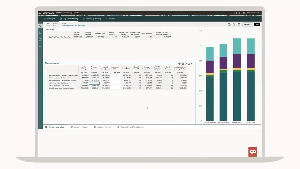Allouez de manière flexible des quotas cibles à l’aide de méthodologies descendantes, en cascade ou ascendantes de sorte que vos quotas correspondent aux besoins de votre entreprise.